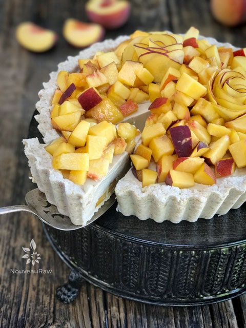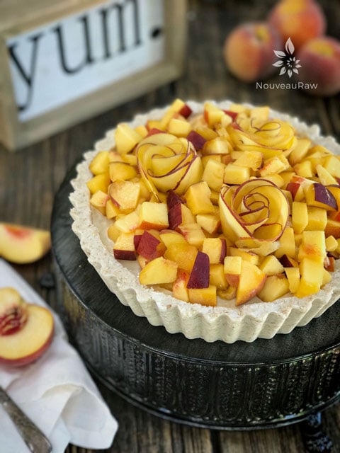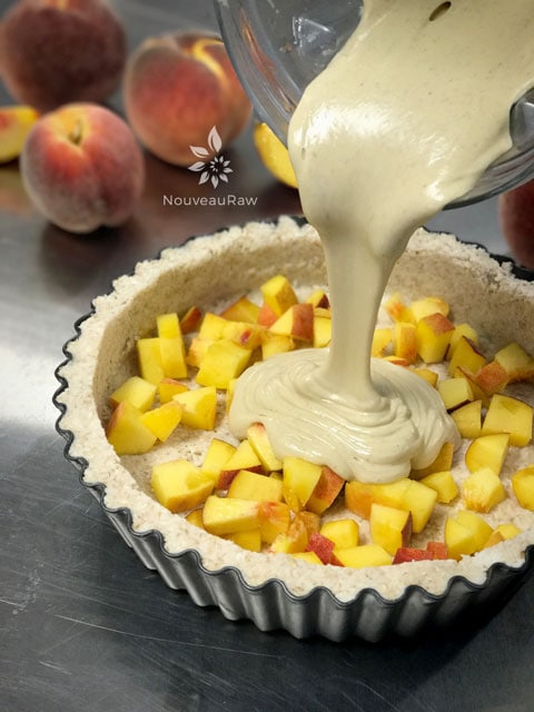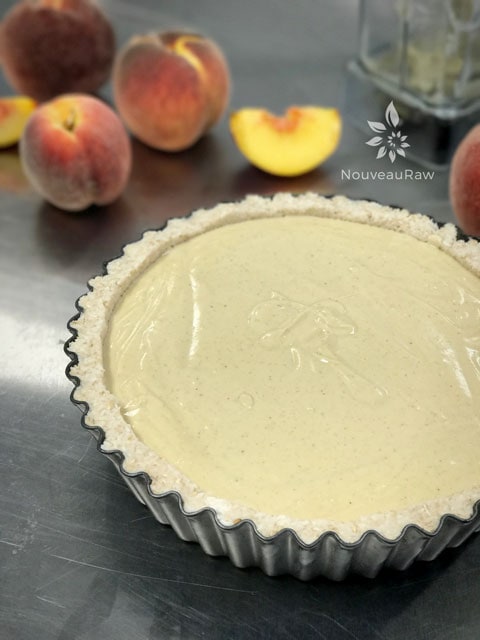 - In a high-powered blender combine the; cashews, peaches, lemon juice sweeteners, vanilla, and salt.