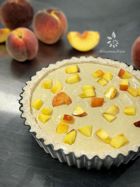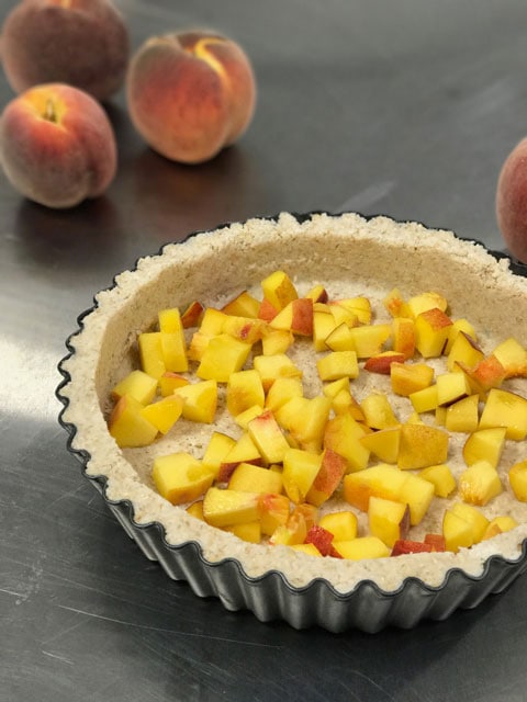 - Scatter 1 cup of diced peaches on the base of the crust. Set aside while you prepare the filling.