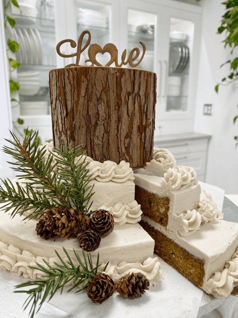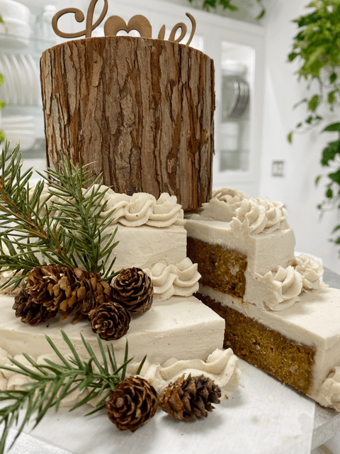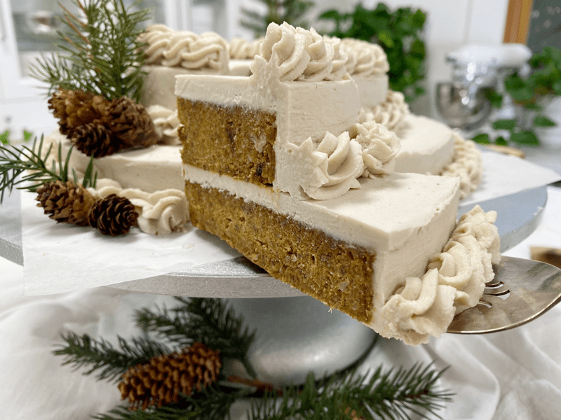 So, what was a girl to do? I frosted the cake, decorated it, removed a slice, took a bite, and had my ah-ha moment. Of course, it was my Pecan Pumpkin Raisin Cake! Hehe, I slid the piece of cake back in the cake, hoping nobody will notice that missing bite. I won’t tell if you won’t.