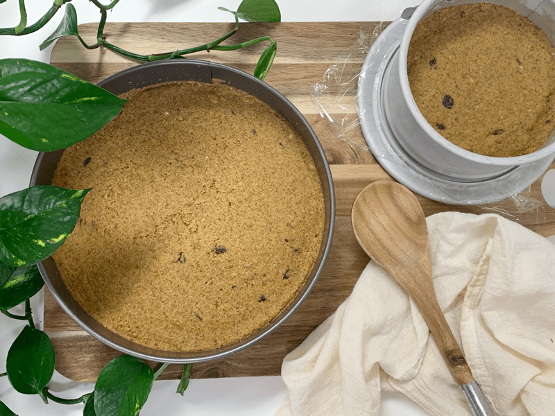 - Let’s start by preparing two Springform pans; a 9 1/2″ and a 6″ pan. Line the base with plastic wrap or parchment paper for ease of removal. Set aside.