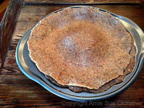 - Flip this over onto the opening of your pan and gently press it into place. You will need to piece it together a bit, just smooth all the edges with your fingertip. You can press lumps of dough around the pan inside, but I found doing it the other way made a nice even layer.