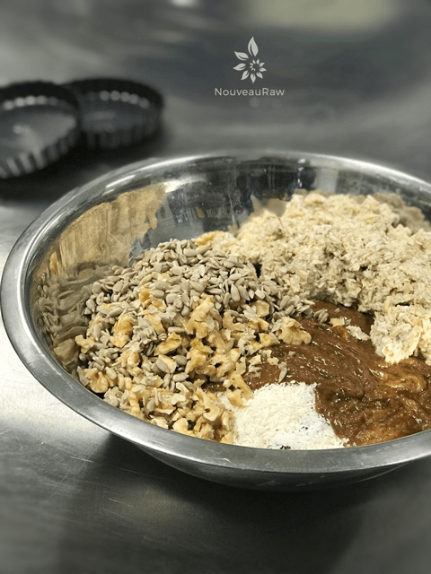 - In the food processor, fitted with the “S” blade, combine the tahini, dates, nut milk, coconut crystals, and spices. Process until it is creamy. Add to the dry ingredients and stir until everything is well coated.
