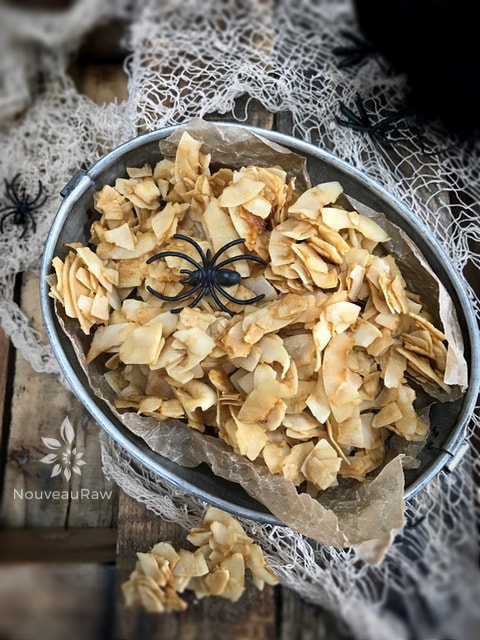 I am always looking for raw food with a “crunch” to it for my salads or just for a snack. These little morsels taste heavenly! Coconut “Bacon” Bits are fantastic. I will admit that they don’t taste 100% like bacon bits but pretty darn close.