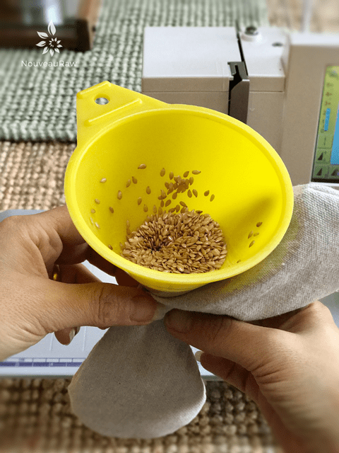 - Place a funnel tip into the opening and pour in 1/3 – 1/2 cup of seeds.