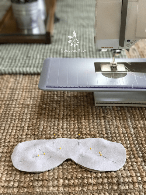 - Tuck the raw fabric edges of the opening inward, so the edges match up with the eye mask edge, and pin shut.