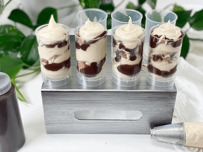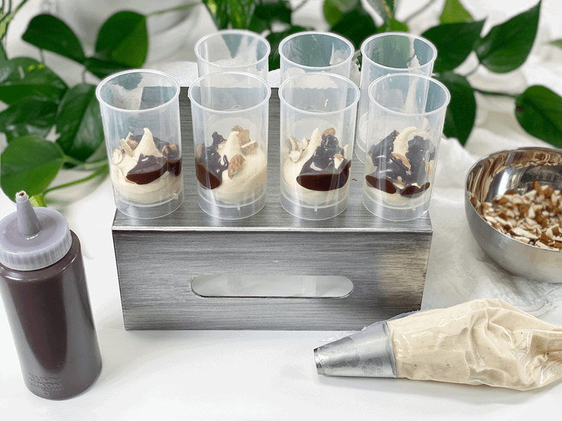 There are several ways to enjoy this recipe. You can make it exactly as instructed or you can skip the freezing process and serve it up as a warm fudge sundae. When putting these push pops together, I made a mental note to save a little behind so I could present a quick afternoon treat for Bob. I placed some ice cream in a bowl, drizzled ganache over it, and sprinkled some chopped almonds on top. He was like a little kid in a candy shop.