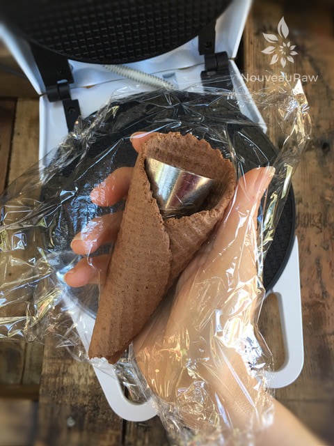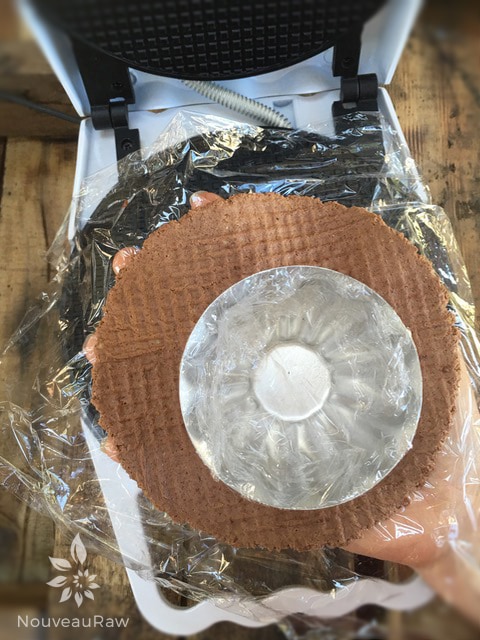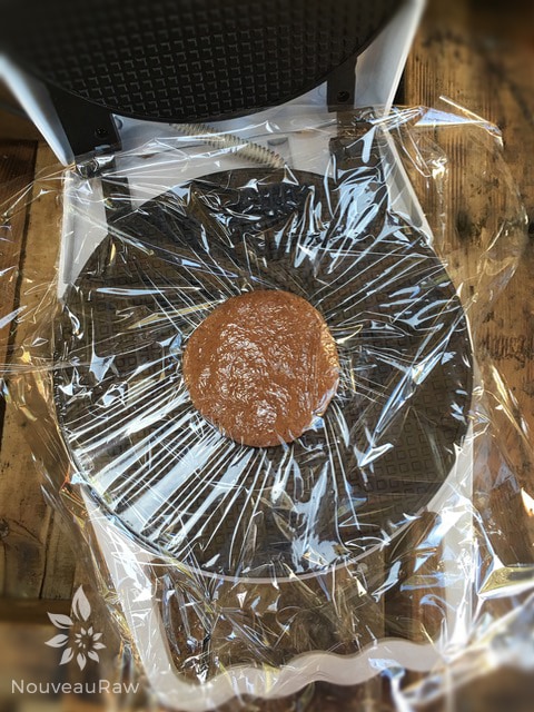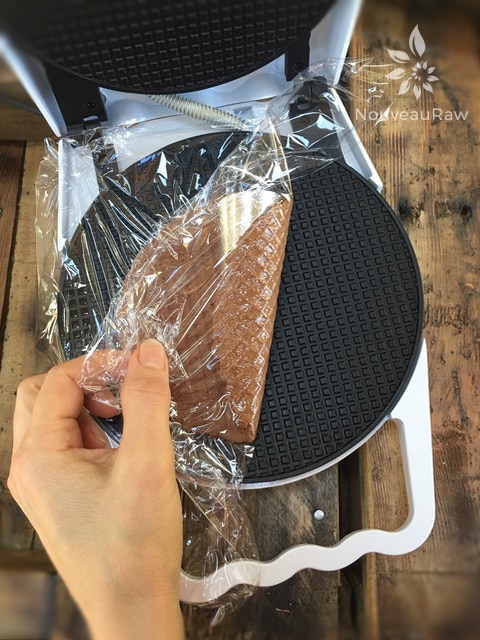 - Line the waffle cone machine with plastic wrap, place the ball of batter in the center, and lay another piece of plastic wrap over the top.