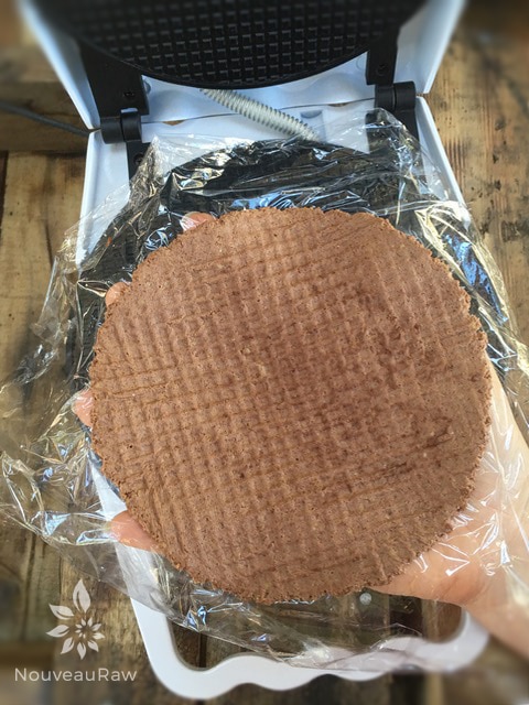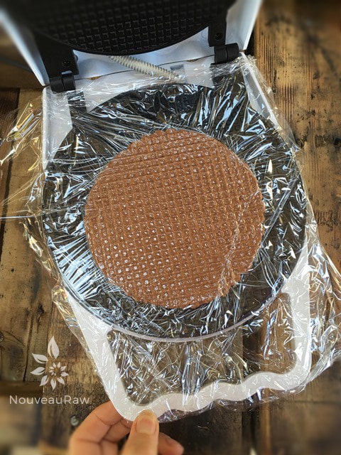 - Open, peel off the top piece of plastic wrap, and remove the flattened waffle cone.