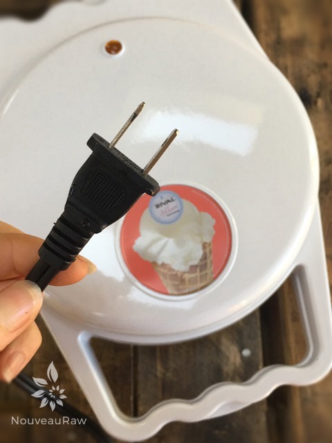 When I made these, I used a waffle cone machine (unplugged of course). Â You can usually find them at your local department stores. Â Or even check the thrift shops… no need to worry if it works or not! Â Â You don’t have to use this machine at all if you don’t want to invest in one. Â You can do all the steps as I instructed below but instead of doing it on the machine, do it on the countertop, it just won’t have the waffle texture.