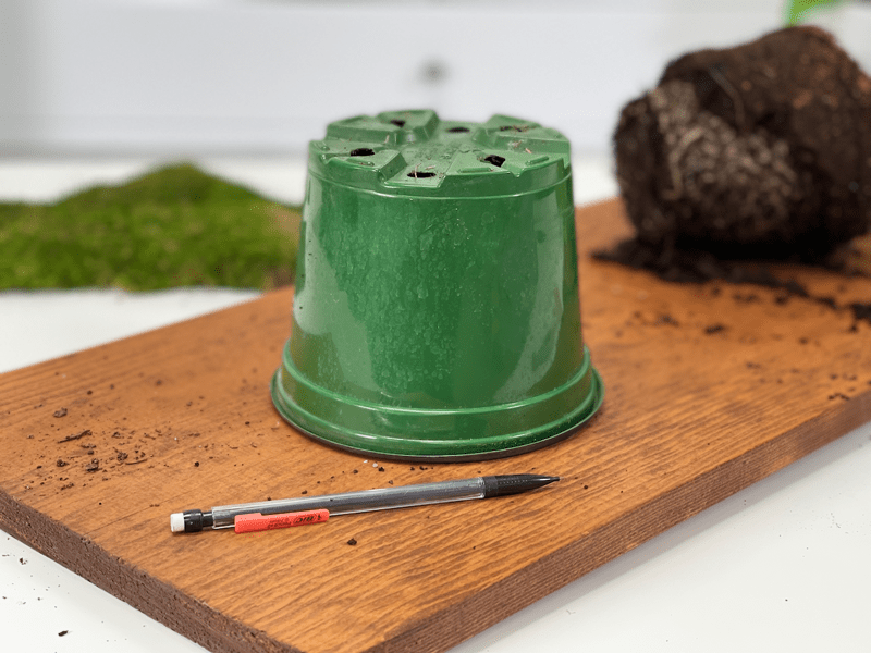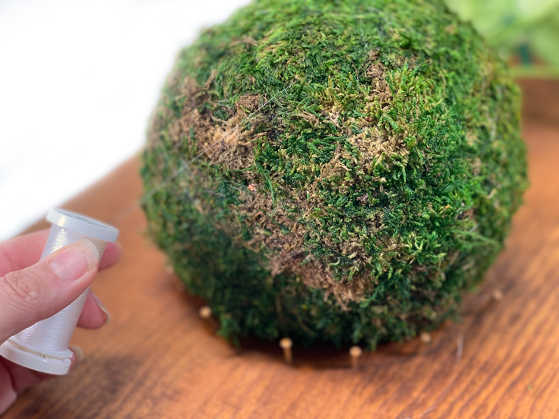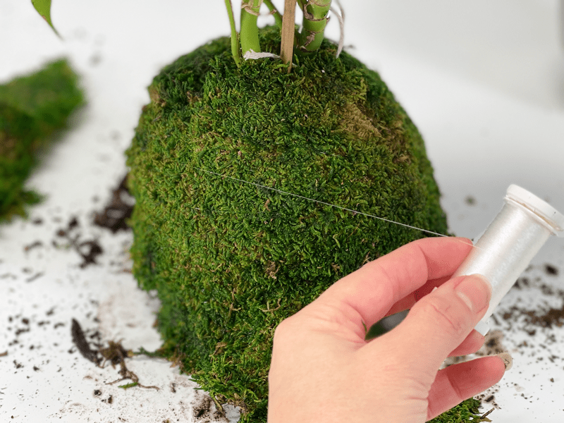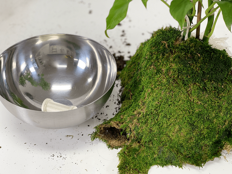 This part gets a bit messy, so an outdoor area or indoor space that you can cover with a sheet or plastic tablecloth is recommended. I already did a very detailed post that explains how to make a Kokedama moss ball, so pop on over there to learn more about the type of moss and soil(s) to use. I will attach some quick photos here for reference, but I recommend reading through it to gather a bit more information on this art form. Click (here).