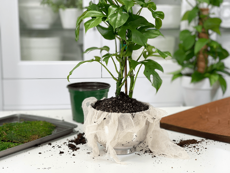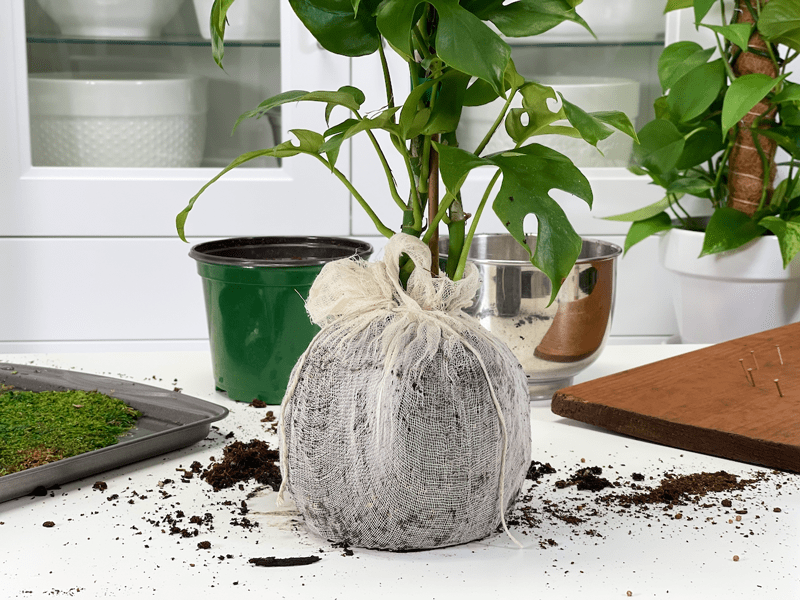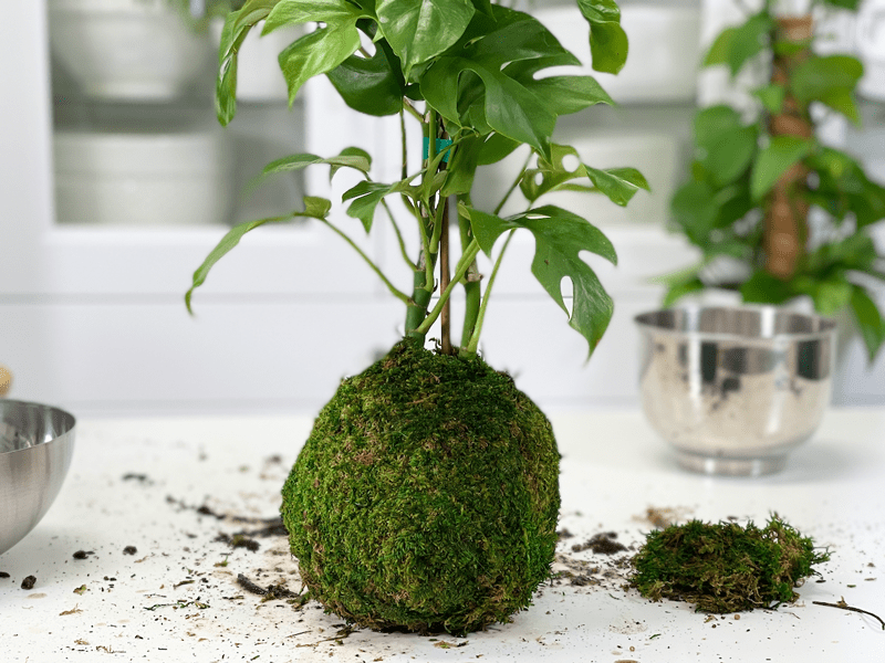 In the same way that plants can outgrow their pots, they can also outgrow their mounts. Therefore it is recommended to re-mount the plant every 1-2 years. It will all depend on whether or not the plant is a fast or slow grower. If you see any type of distress on the plant and you can’t correct it through double-checking the plant requirements (light, water, etc.) you might need to remove the plant from the moss ball and replant it in a nursery pot. Just in case you might be wondering, I used a Rhaphidophora tetrasperma plant in this creation. For other plant options, click (here).