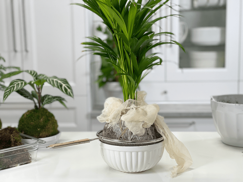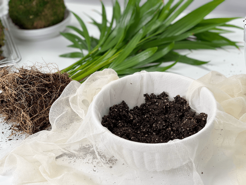 The soil mix recipe for Kokedama can vary slightly but typically will include the following “ingredients.” Once you have the soil measured out in a bowl, add enough water that is necessary until the soil holds its shape when pressed into a ball. If you accidentally use too much water, you can a bit more houseplant soil, but we will also be draining excess water with a strainer. The amount you mix up will depend on the size of the plant you are using.