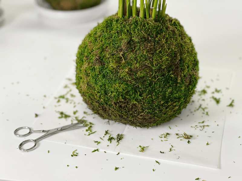 Optional – once you are done with the ball, I like to trim off any fringes from the moss to create a clean look.
