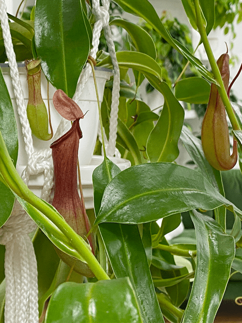 Nepenthes are slow growers during their first few years and can take 5 to 10 years to mature. Once established, they will begin to vine and grow rapidly. At this stage, trap stems will loop around and cling to any available support. Right now, ours are wrapping around the macrame string which it is hanging from. Be sure to provide ample support for the plants during this vine-growing stage. Flowers can occur on the tips of the growing vines, and it is recommended to remove them, since they take quite a bit of energy to grow. We have yet to experience any flowers on ours.