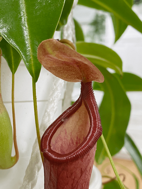 If you would take a moment to really look at the photo above, I’d like to point out a few characteristics of this plant. #1: If you look at all three monkey cups, you will notice that they are at various growth stages. The far-right one hasn’t opened its lid yet. #2: As I have mentioned above, these plants vine in their natural habitat. If you look at the top center of the photo you can see that the tip of the plant has vined out and is wrapped around the plant hanger cord. #3: If you look at the largest monkey cup in the photo, you will see a “shadow” or a darkening in the belly of the monkey cup…that is the water/food line which shows how much stuff is inside of it. Pretty cool stuff, if you ask me!