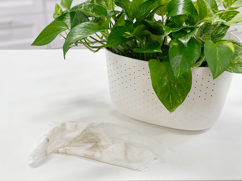 - Solution: Take the plant to the kitchen sink and drench it with water. It is best to use plant containers with drainage holes in the base. I like to give it a good dose of water, let it soak in, add more water, let it soak in…repeat until the water runs out of the base.