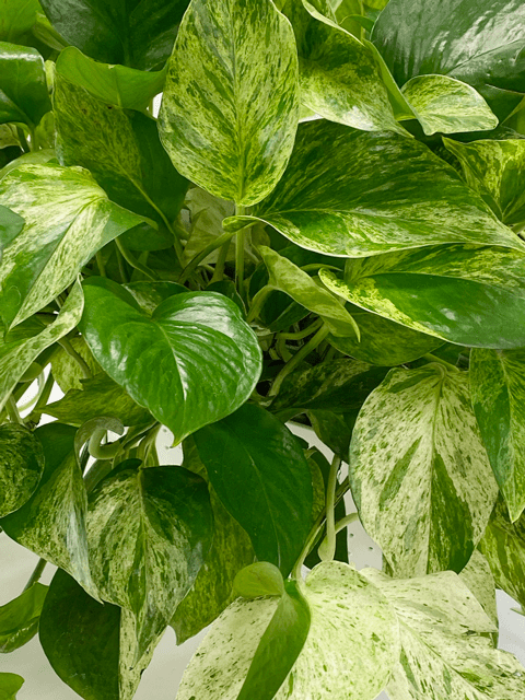 Marble Queen (Epipremnum aureum ‘Marble Queen’) is another common pothos variety. It features heart-shaped green leaves heavily splashed and streaked with creamy white. The foliage is usually similar in size to golden pothos but a bit more challenging to grow, which I discuss below. Marble Queen is the most popular cultivar and very slow-growing. It is highly variegated, with foliage that tends to be more white than green.