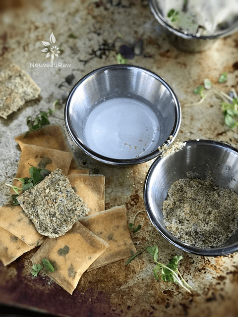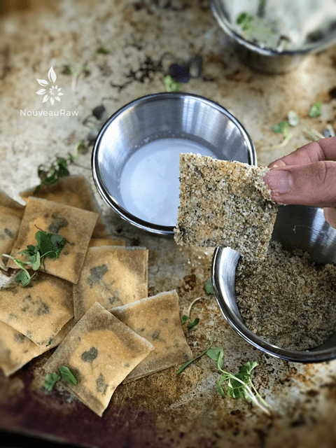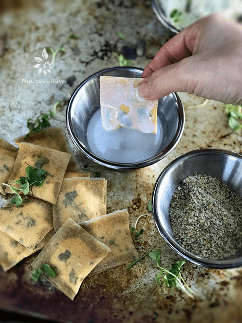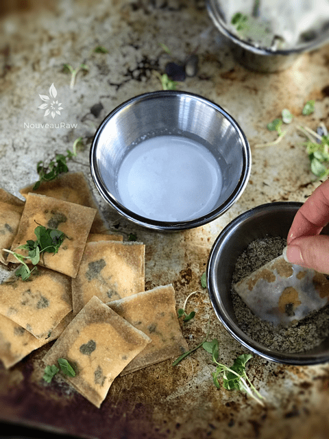 So on to the recipe at hand… Crusted Herbed Macadamia Nut Cheese Ravioli… I have to confess that some childhood memory didn’t spark the craving for such a dish. It was designed out of necessity; I needed a plate of food that was nutritious and grounding. I wanted a plate of food that wouldn’t leave me feeling bogged down. Instead, I wanted to walk away feeling light, satisfied, you know, the type of dish that makes your taste buds squeal in delight.