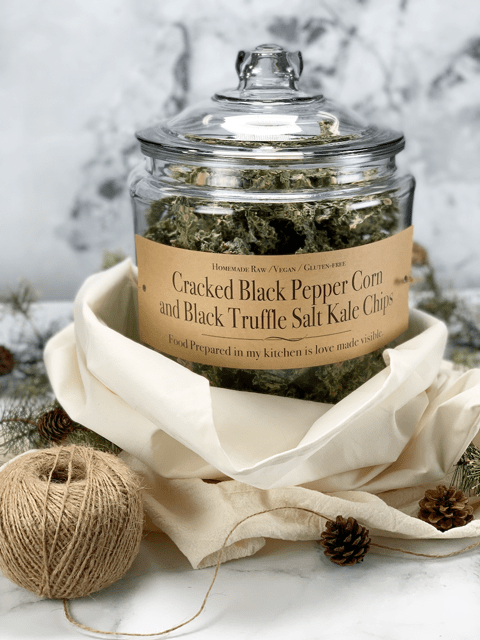 For Christmas this year, I made a LARGE batch (actually five batches combined) of kale chips for a friend of ours who has a great love for kale chips as well as exotic flavors… so I just knew that I needed to make kale chips that were infused with black truffles. At first, I thought of truffle oil, but from my years of watching the Food Network programs on TV, I learned that most people don’t know how to balance it with other foods, and it can unpleasantly overtake a dish. I veered away from the idea of using the oil.