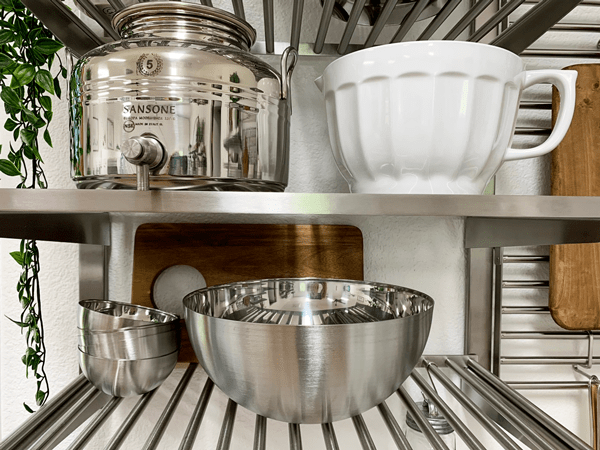 The other upper cabinets that flank the fridge and freezer are also made with glass fronts. I wanted glass in these because I knew that I would be displaying my catering and photography dishware in these. I filled them with white and stainless steel. Both colors are versatile for any event I am hosting, and they accentuate the beauty of the foods I create. I also love heavy ceramic bowls. It reminds me of when my Great Grandmother would stand in her kitchen with a massive ceramic bowl in the crook of her arm, resting the bowl on her hip, while briskly stirring the ingredients within it with the other hand. All while attending to the endless questions that I had as a child.