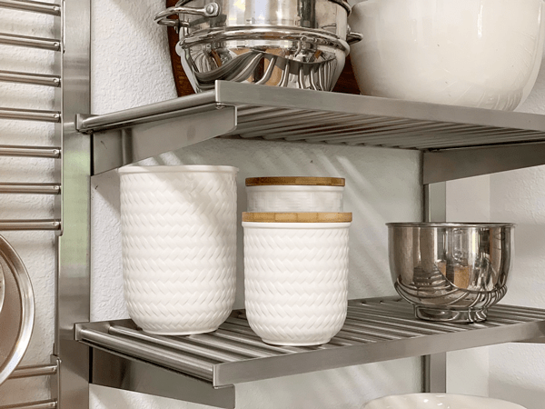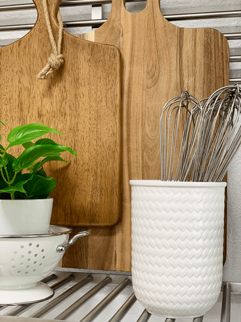 This won’t always be feasible in a kitchen space due to size and aesthetics, but for my area, it was perfect. I selected an open shelving system that allowed me to display it in any configuration that I wanted! To me, it’s functional, creates efficiency, and is beautiful… all rolled into one. I presented a mixture of everyday items that I use, along with some decor items (but made sure that I didn’t get to carried away with tiny tchotchkes (knick·knack) things). Everyday items can become “art” too. The use of these shelving systems also kept the space feeling open and airy, as well as adding a balance of weight throughout the room. I used IKEA’s Kungfors system.