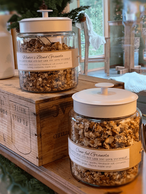 When creating a Breakfast Bar… look around your house for tables that might work. I stole this table from my entryway (which I picked up at a garage sale for $25), I velcroed the “Gathering” sign to the frame of the stand, tucked in some Christmas greens, and garnished it with a string of clear lights. The glass containers were hiding in my pantry, sitting empty with black lids. I gave them a quick coating of white spray paint and designed a label. Be creative with what you have!