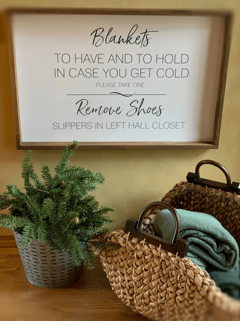 We live in the midst of an orchard, so when guests enter our house, we ask that they remove their shoes, which can leave people with chilly tootsie-pops… so to remedy that, we provide slippers for them. Inside our entry closet, I have a shoe hanger right inside the door filled with all sizes of slippers. I made a sign that is easily seen as soon as they enter the house. See photo below.