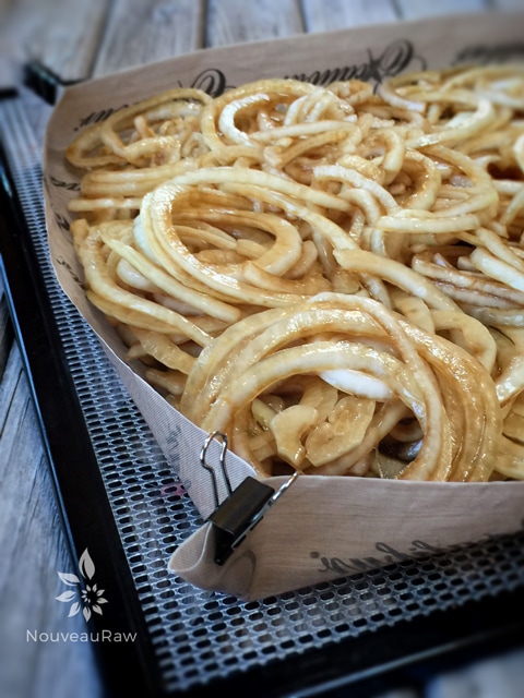 Well if you want them “caramelized” and don’t own a dehydrator you can use your oven. Chances are the heat will get to high and remove it from the raw state. I haven’t tried it but you could turn the oven on, setting it on the lowest possible temp. Keep the oven door cracked. Spread the onions on a baking sheet and place it on the center rack in the oven.