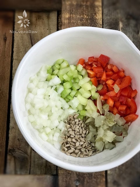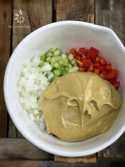 - Add the bell pepper, celery, green onion, sunflower seeds, and cubed avocado. Gently fold into the sauce. Don’t over mash the chunks of avocado. We want the texture which resembles chunks of egg whites.