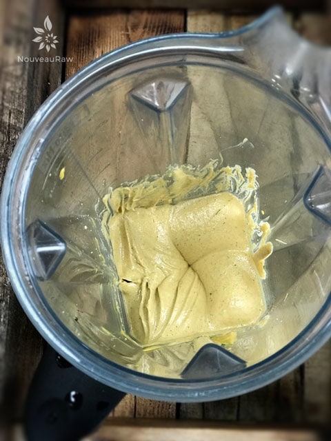 - Add the water, mustard, apple cider vinegar, agave, paprika, onion powder, dill, curry powder, turmeric, Indian Black salt, and pepper. (Whew, I think I got it all). Blend until smooth and creamy.