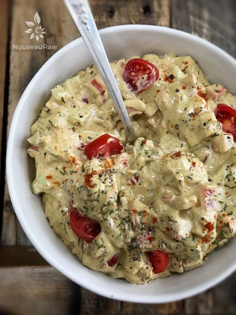 This eggless “egg” salad is excellent on crackers, raw bread, or a dollop on a bed of greens, perhaps wrap it in Boston Bib Lettuce or … eat it all by itself… spoonful after spoonful.