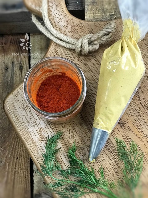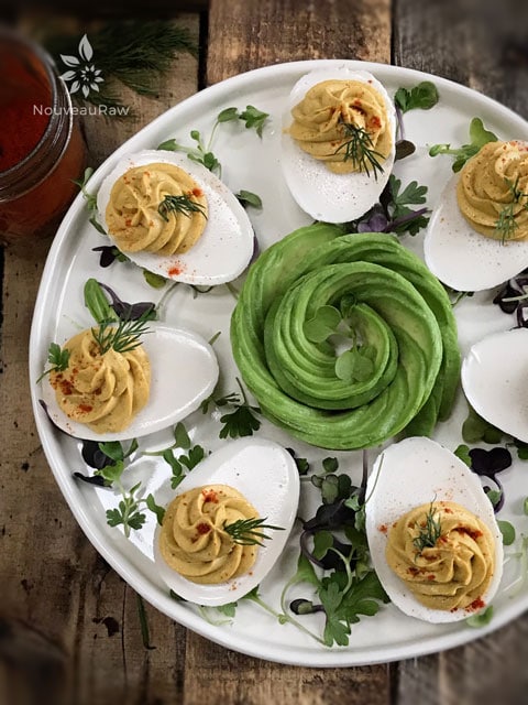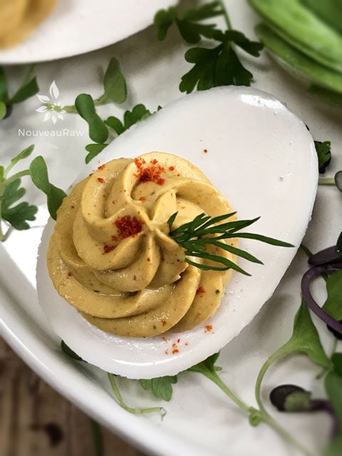 just found your site! Fantastic! These deviled eggs, I am going to try. About to experiment with “eggless egg ” salads as I really miss that. I think I will take some of your techniques and try. Also, a friend made an “egg” salad out of soaked garbonzo beans, much like when you make a raw hummus, only he put it in vitamix, so it would be smoother. Then, instead of hummus ingredients, he put tumeric, then egg salad type ingredients. Must admit, very very similar to what the real thing is like. I cannot eait to combine his ideas, yours, and mine. We will see what I end up with. This is one of the best raw food sites I have found so far. I am overweight, significantly, but a real foodie. Looking to get off this excess, and enjoy the process.