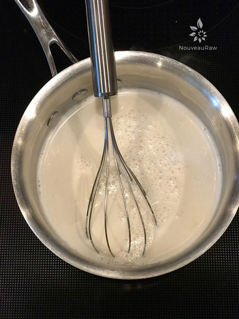 - Remove from the heat and stir in the almond milk. Move quickly because the agar will start to gel if left to cool too long.