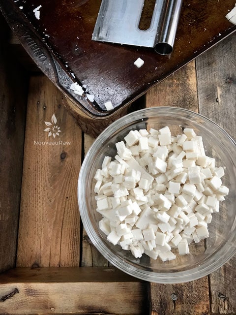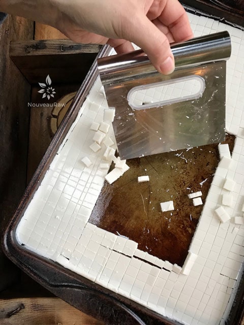 - Once firm, remove from the pan and dice into small bite-size cubes.