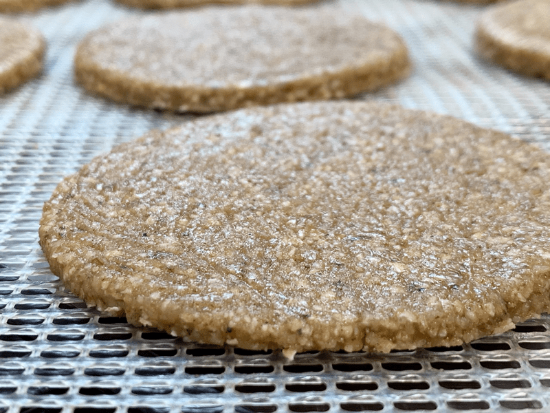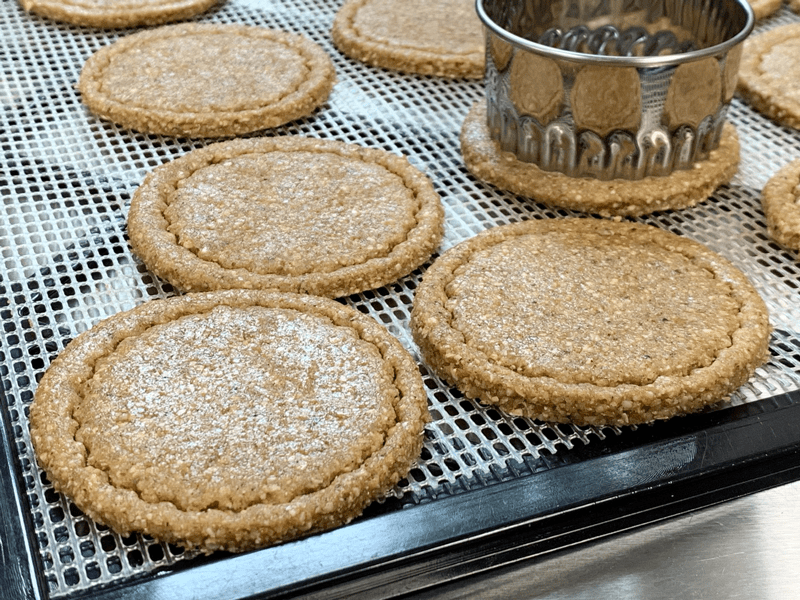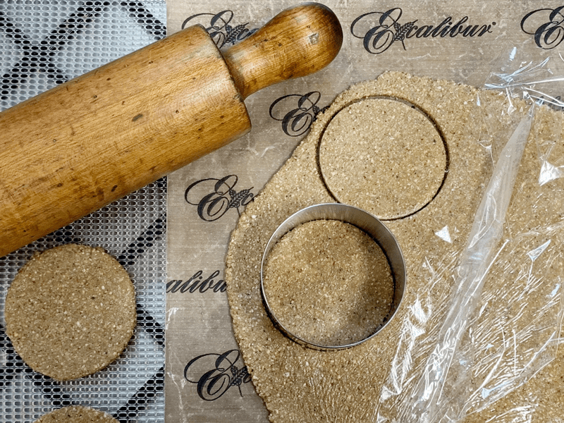 - Line the dehydrator tray with a non-stick sheet and place the batter in the center. Shape into a ball, cover with plastic wrap and roll out to roughly 1/4″ thickness. Remove the plastic and with a circular cookie cutter press out the circle shapes. GENTLY transfer to the mesh sheet.