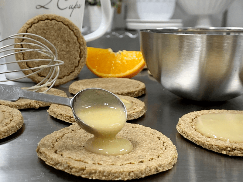 - In a small bowl whisk together the coconut butter, orange juice, and maple syrup. It will be runny at first. If the oranges are cold when juiced, it will cause the glaze to thicken quickly. If that happens, you can place the bowl in the dehydrator just to soften it so you can easily spread on the cookie tops.
