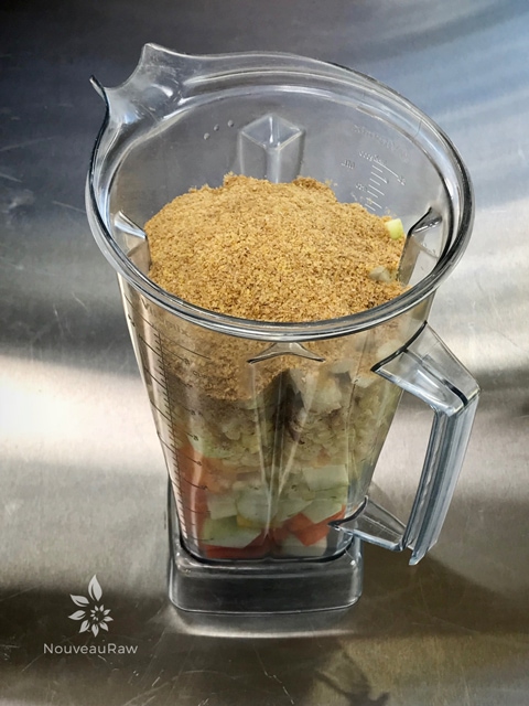 - In a food processor, fitted with the “S” blade, combine the corn, zucchini, bell pepper, onion, lemon juice, salt, cumin, chili powder and ground flax seed. Process until the batter is smooth.