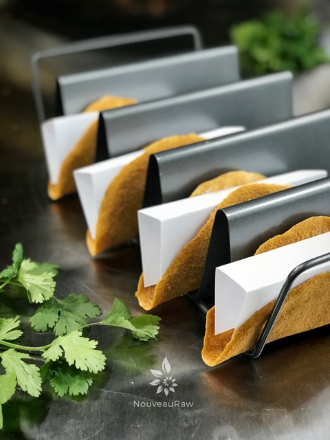 I used my baked taco shell holder (not exact but close) to shape the shells. You will need a dehydrator that has a box cavity such as the Excalibur, Sedona, or equivalent. I placed plastic wrap over each hump on the holder and gently laid the pliable shell over it while helping it ever so carefully into the shell shape. I provided photos below demonstrating this process. You will become the Taco Shell Whisperer. Hehe, I can fit two of these units in my 9 – tray Excalibur. If you don’t own a dehydrator, you could bake them in your oven, but they most likely won’t remain raw. You will still be ahead of the ballgame through, regarding nutrients and quality control of ingredients.