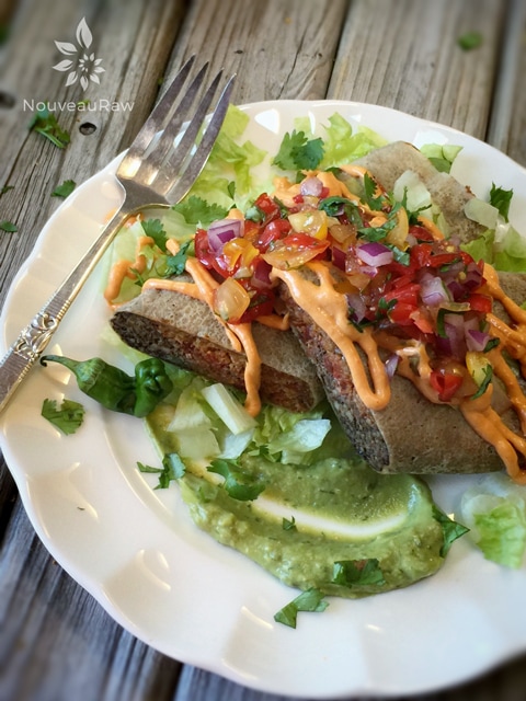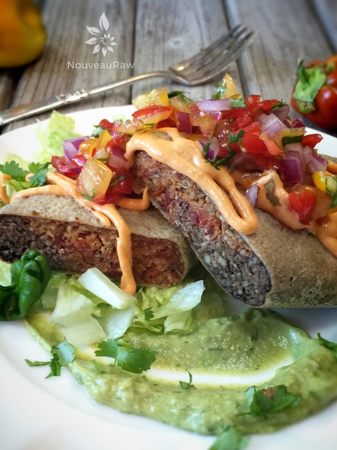 Another beauty of these burritos is that they are freeze-able, thus creating an incredible, raw, healthy, kitchen staple that will compliment your hectic lifestyle. Just make sure that you wrap each one individually and then slide them into freezer-safe zip lock bags. They should keep for 1-2 months in the freezer. When you are ready to have one, remove from the freezer and allow it to thaw, unwrapped. If it thaws in the wrapper, condensation builds up a bit making the burrito a little wet on the outside. You can eat it at room temp, warm in the dehydrator or even in the oven if you watch it very carefully.