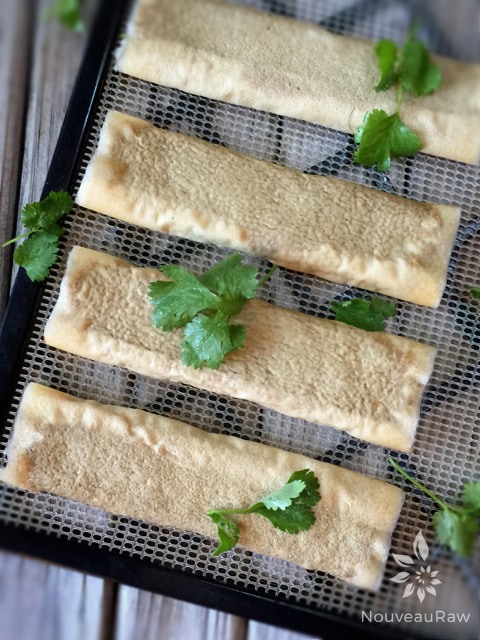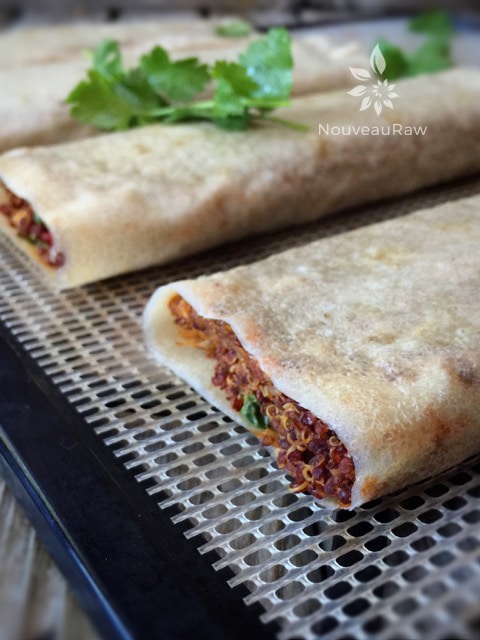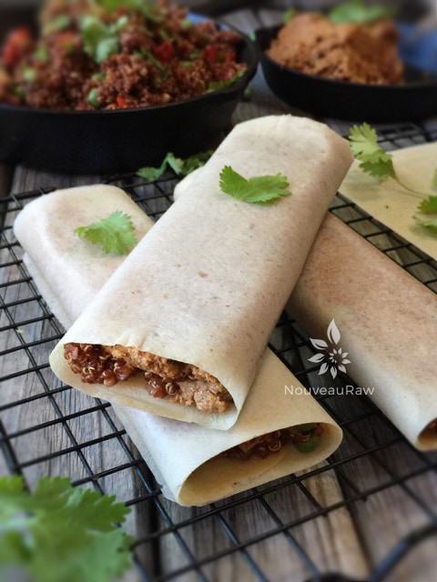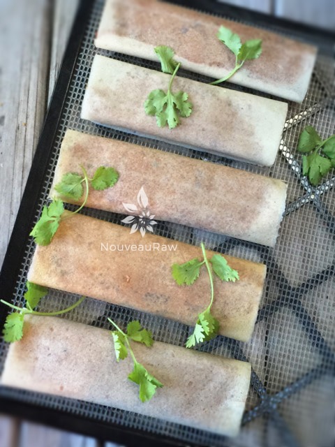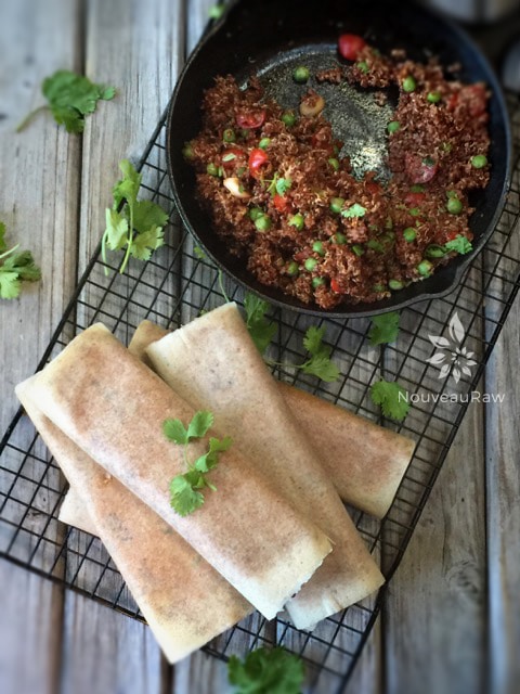 Instead of using flour tortillas, I used coconut wraps. You can make your own or purchase them… both being raw. I posted a link below to the ones I like if I use store-bought ones. They don’t add any coconut flavor to the dish, and after dehydrating for roughly four hours, they turn into the perfect flour-like tortilla that allows you to hold it in your hand, enjoying bite after bite, or you can eat if off a plate, and it is perfectly fork-tender.