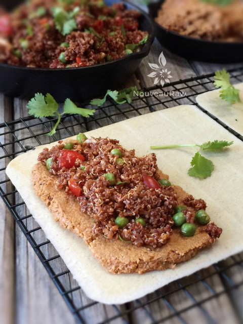 - Lay a coconut wrap on the countertop, place 1/2 cup of the refried “beans” and 1/3 cup of the Spanish quinoa on one end of the wrap.