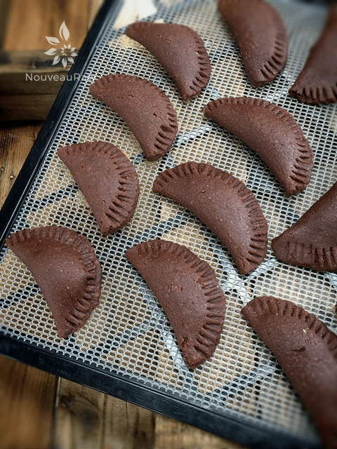 - Place your empanadas on the mesh dehydrator screen and dehydrate for 1 hour at 145 degrees (F), then reduce to 115 degrees (F) and dehydrate for at least 5 hours or until desired dryness is achieved.
