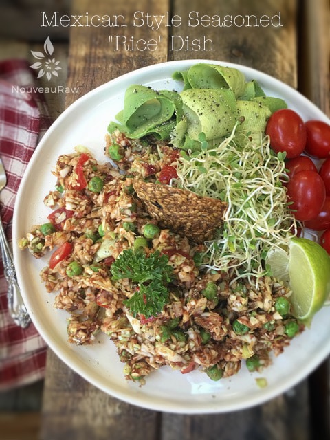 At a quick glance; burger patty, rice, green salad, cheese, and fresh tomatoes. Now to break it down to the nitty-gritty… of course, you know that everything plated is raw, vegan, and gluten-free.