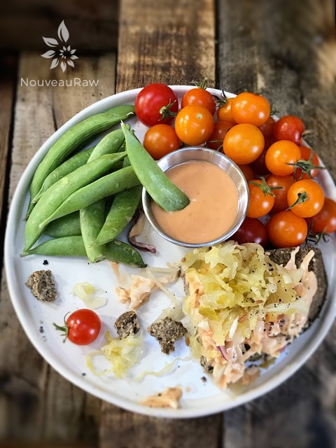 After sniffing a few seeds up my nose, by accident, it jogged my memory… and made me snort. Reuben sandwiches! It was time to create my raw version of Reuben sandwiches. So, here is a recipe mashup using several different components. This sandwich really satisfies that craving for comfort food. I hope you enjoy it.