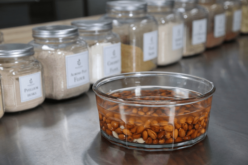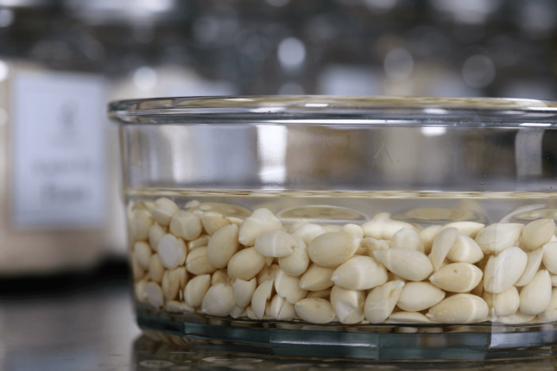 - In a glass bowl, soak almonds in twice the amount of water as the almonds (they swell some).