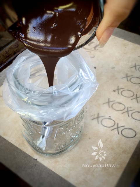 5. Make sure the melted chocolate that you are using isn’t pure liquid when adding to the piping bag. I find it helpful to first stir it around in a glass bowl while it starts to thicken up a tad… now it is ready to put in the bag.