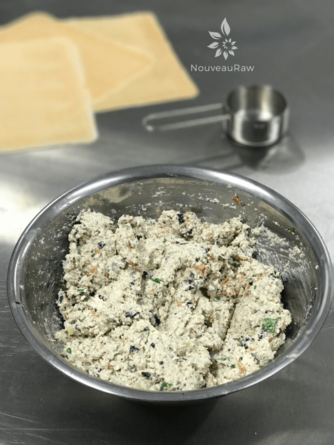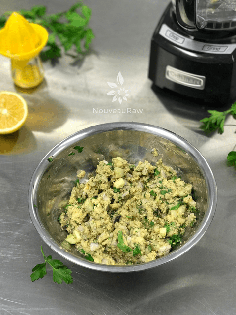 - In a food processor, fitted with an “S” blade, place the drained almonds, sunflower seeds, water, lemon juice, kelp, and salt in the processor. Process until almost paste-like. Put into a bowl.