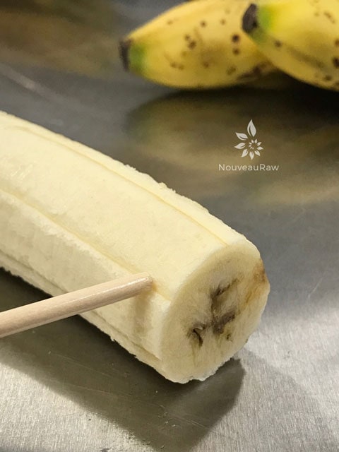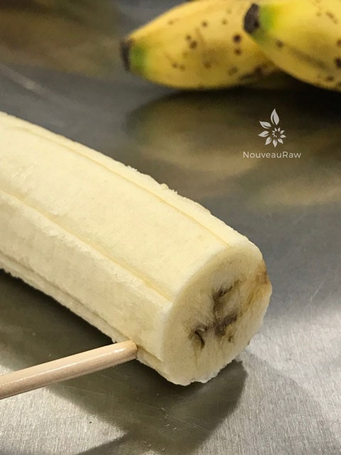 Once the bananas are done, it’s time to spread some date paste on the inner side of the banana slice. You can do this one of two ways: