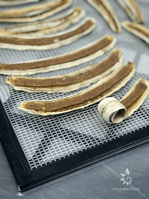 To start off with, I sliced the bananas and popped them into the dehydrator. This isn’t one of those times that you can allow time to escape you. Set a timer for roughly four hours and check to see how they are doing. You don’t want them 100% dry. They need to retain some moisture that you can easily bite into them and also so you can form them into “cinnamon roll” shapes.