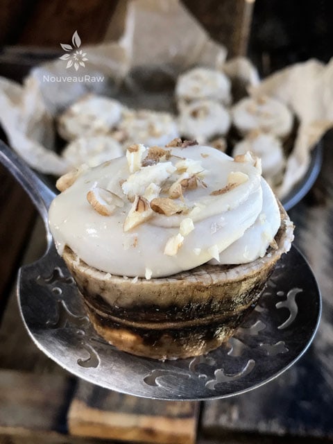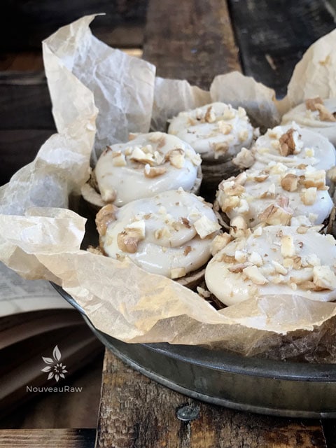 - If you wish to enjoy them warm, hold off on the frosting and pop them in the dehydrator for a few hours. Once warm, pipe the frosting on top and enjoy immediately.